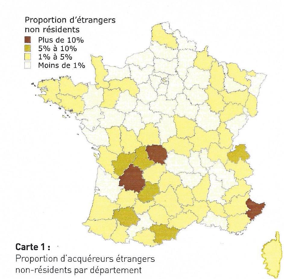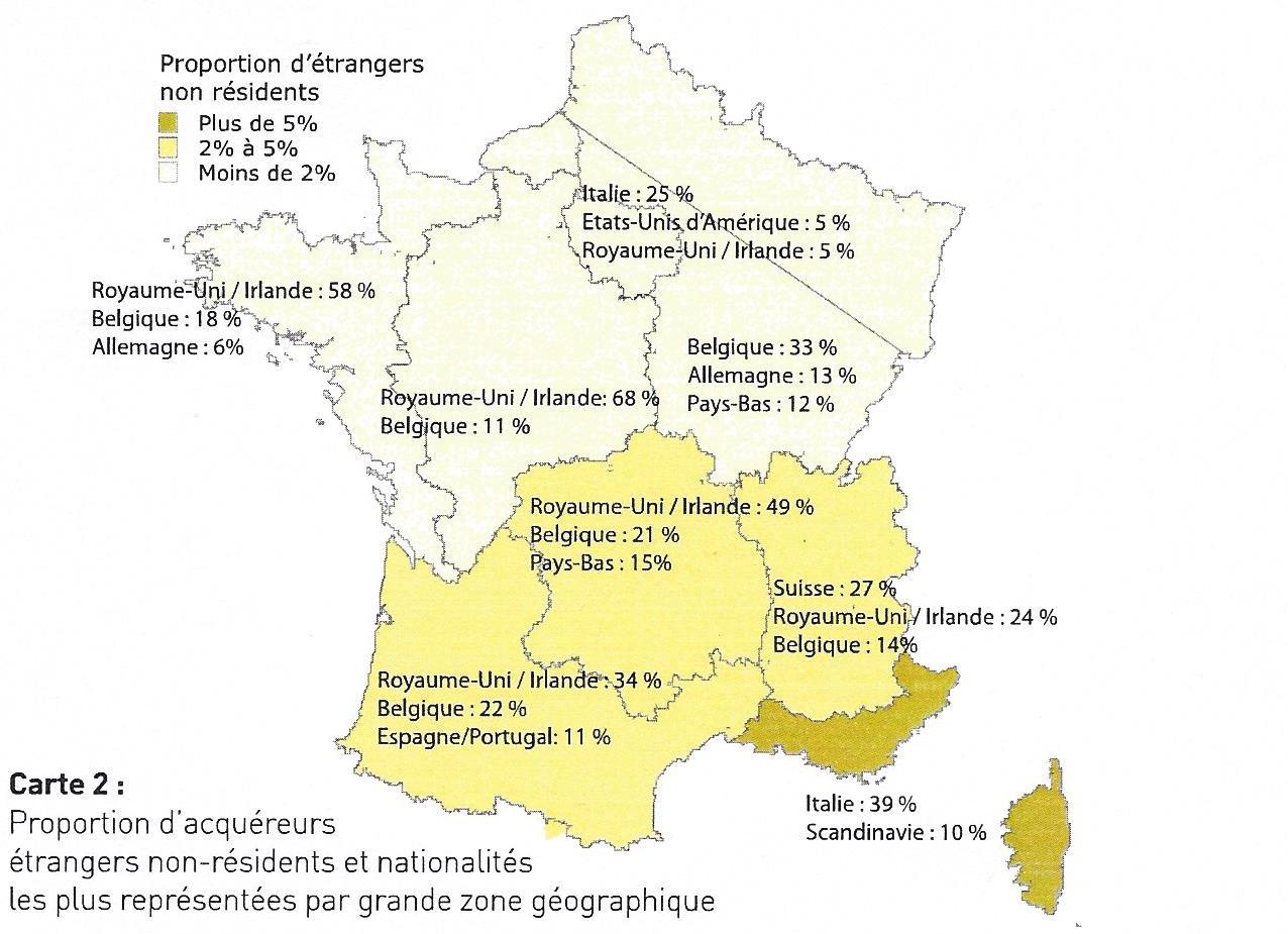 En fait, la part des achats immobiliers effectués par des étrangers non-résidents représente moins de 2% des transactions entre 2009 et 2013, mais on peut avoir, dans certaines régions, des proportions plus importantes. Près des frontières, comme dans les Alpes Maritimes où les étrangers non-résidents représentent 12% des acheteurs, ces derniers sont alors en concurrence avec les acheteurs locaux dans un marché actif. Les Italiens représentant 39% des acheteurs étrangers dans les Alpes Maritimes.