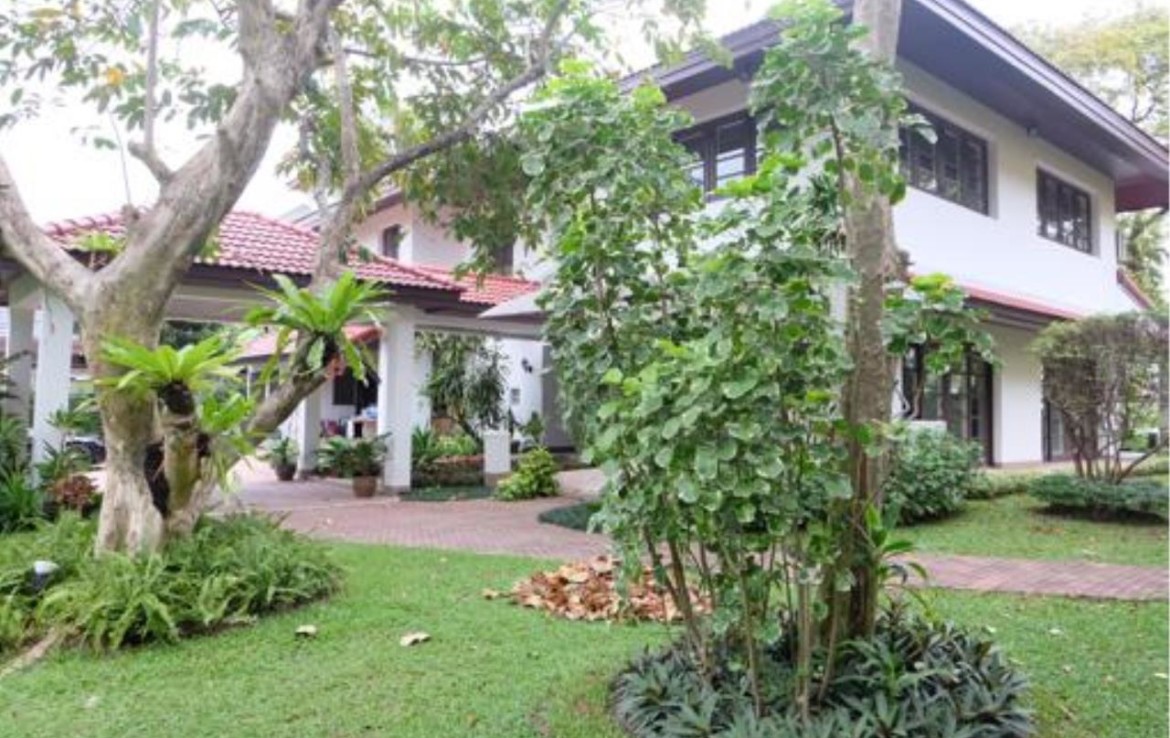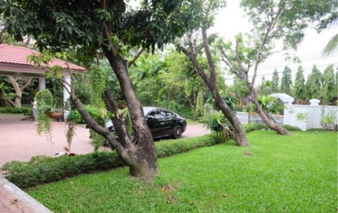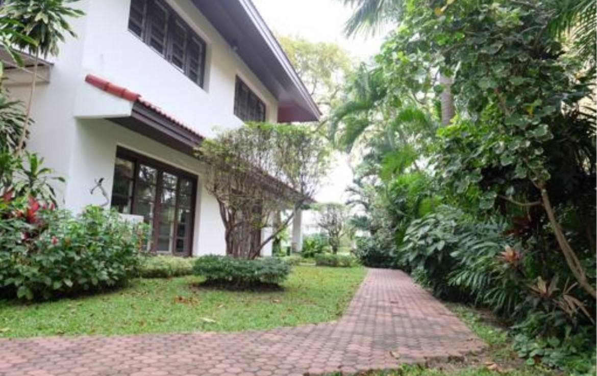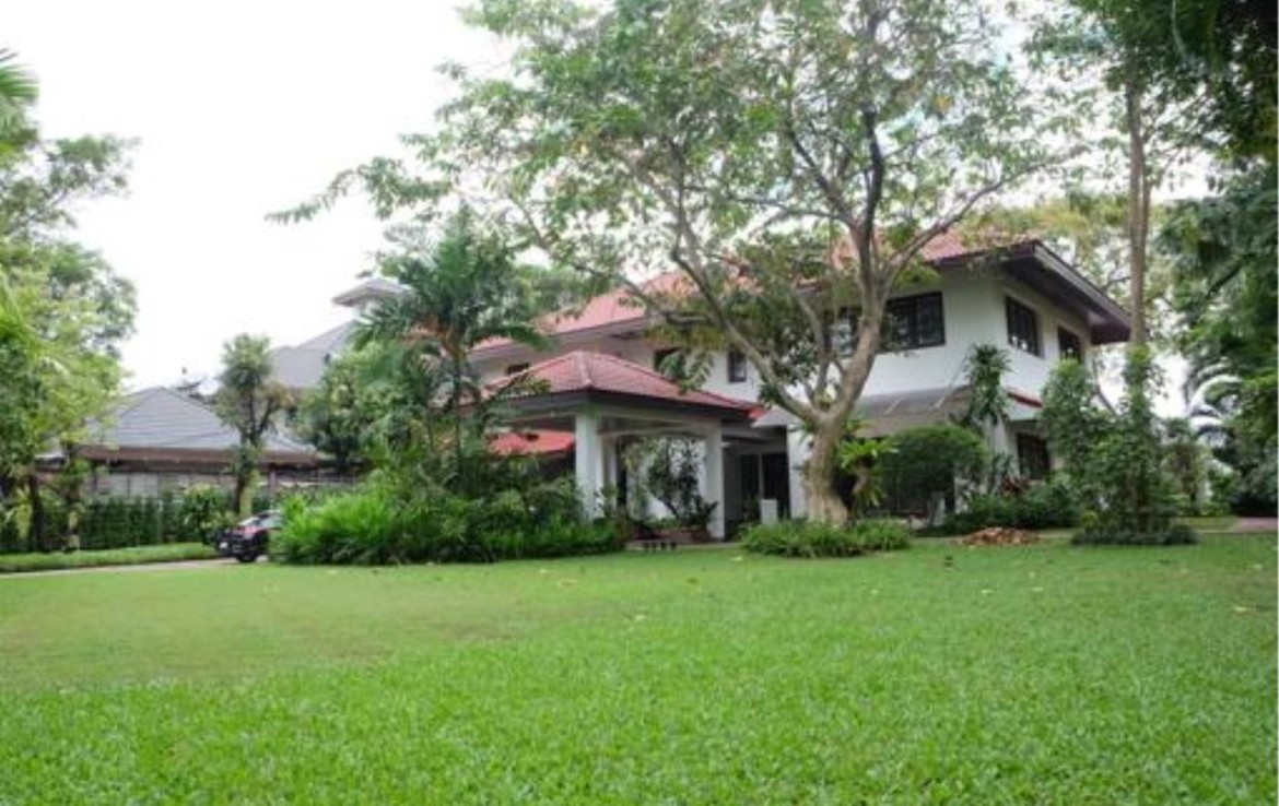 Superb modern contemporary house at Lakeside Villa, Bangna. Jim Thompson’s high grade, fully furnished 3-and-a-half bed and bathrooms home with large trees surrounding it. The location is an angle point to the lake’s cutting edge area which is most beautiful in the complex. The large master bedroom is connected to a large living area. It has walk-in closet, large marble jacuzzi bathroom while the second bedroom is also spacious, has ample sitting area, walk-in closet too, and good sized bathroom. The third bedroom is a good medium sized one with bath and closet space. There are fully equipped European open kitchen next to the dining room and another Thai kitchen behind that, 3 servant rooms, separate shower and toilet with washer and dryer on the outside. The ground floor living-cum-dining-cum pantry sizes approximately 4-500 square meters.