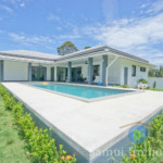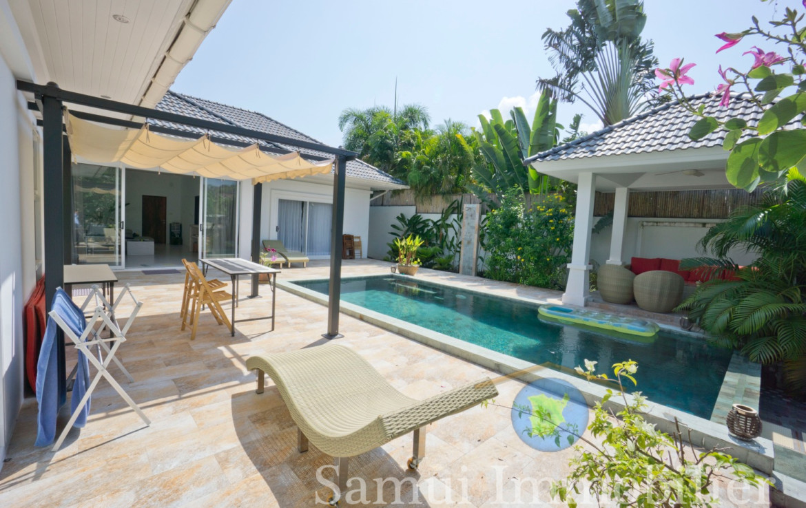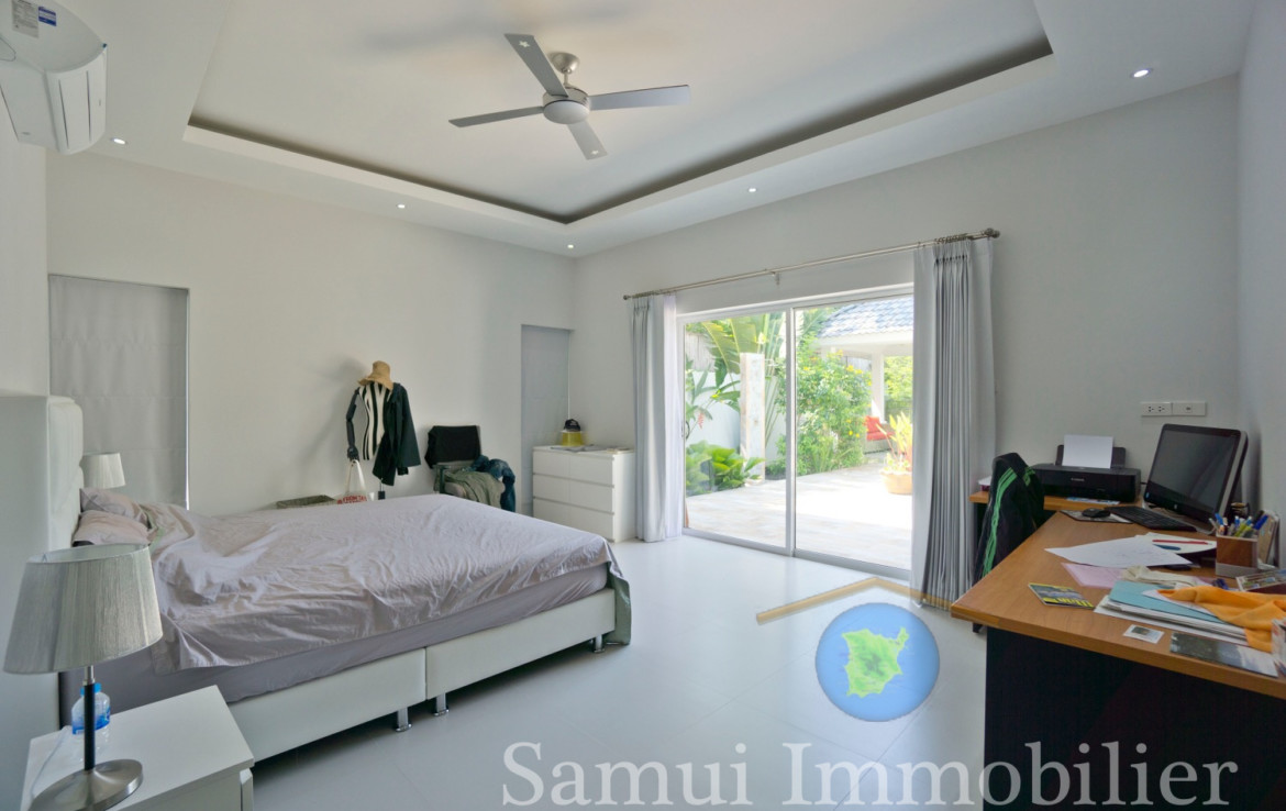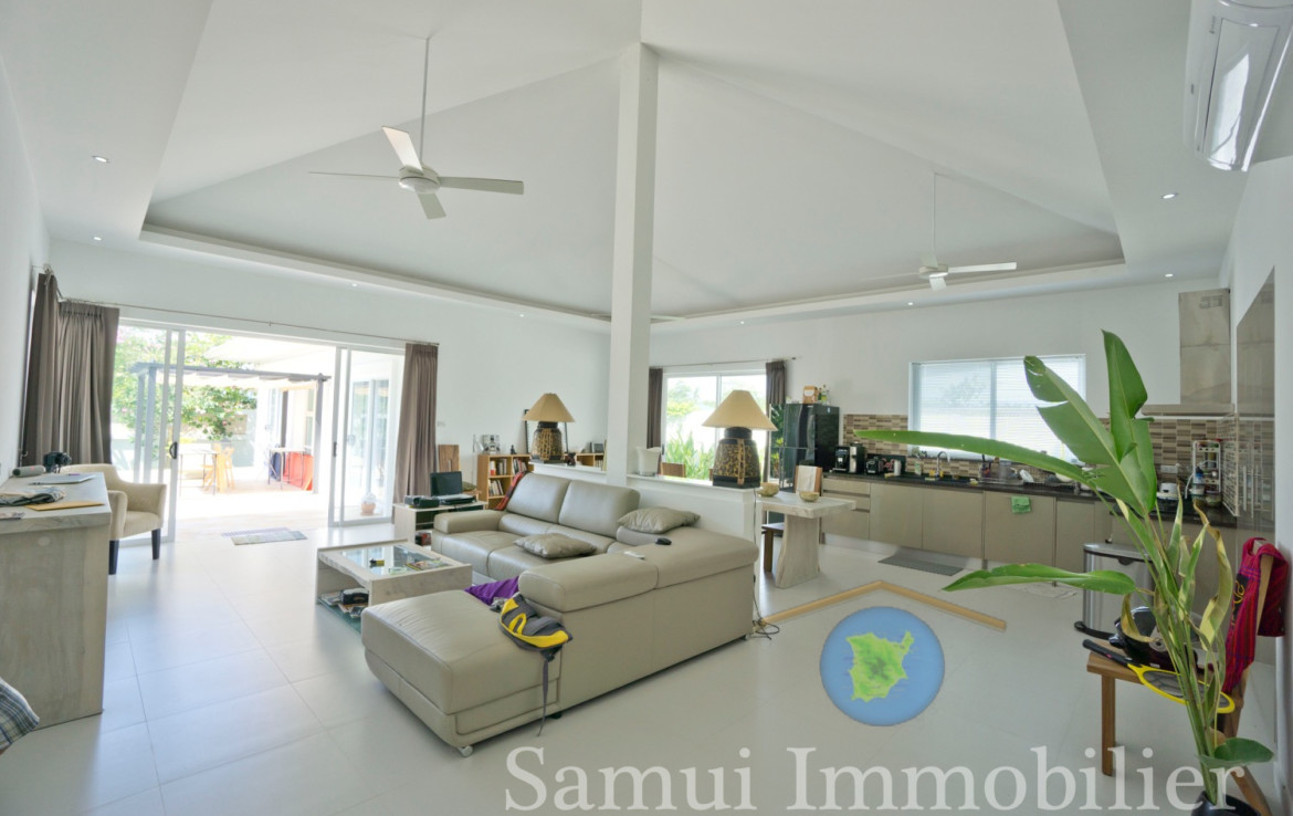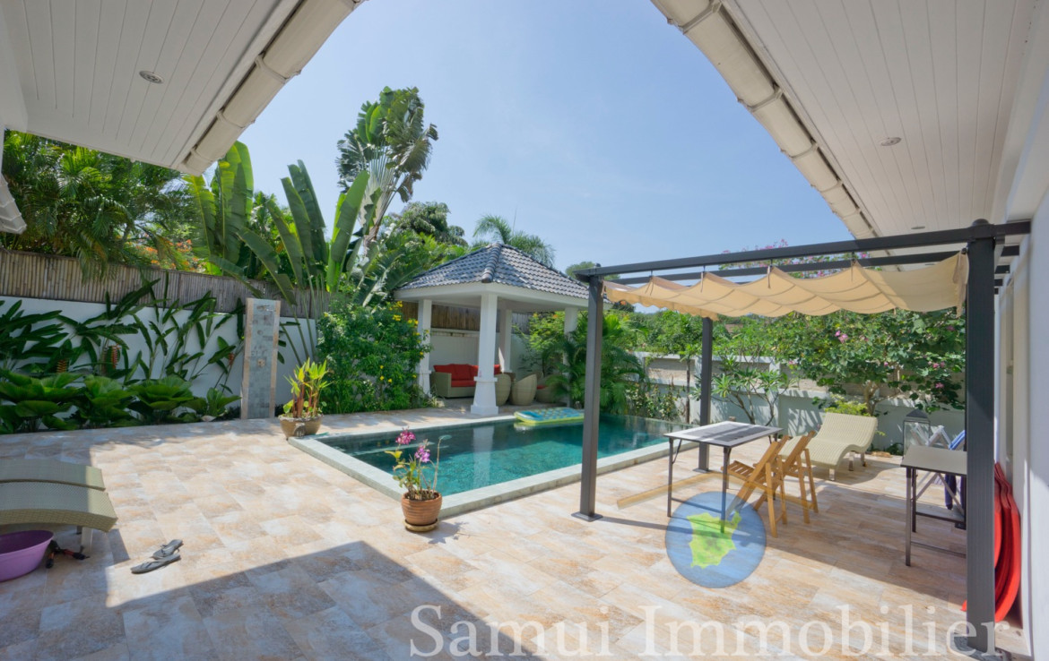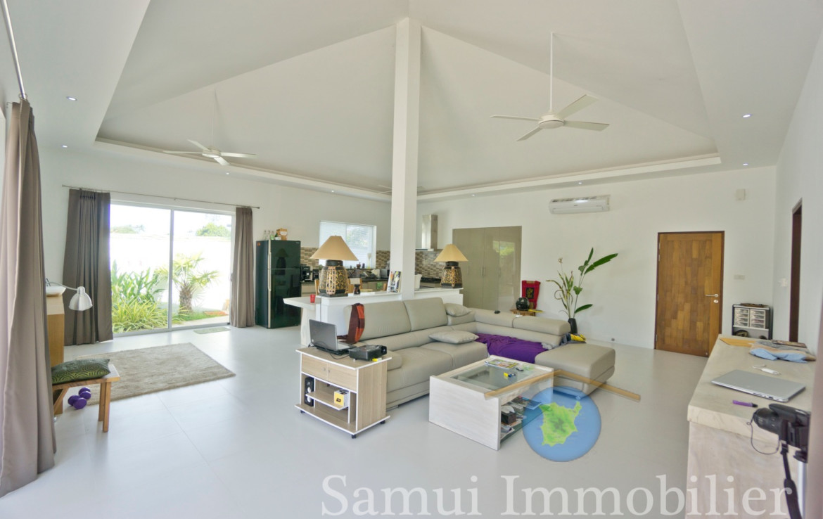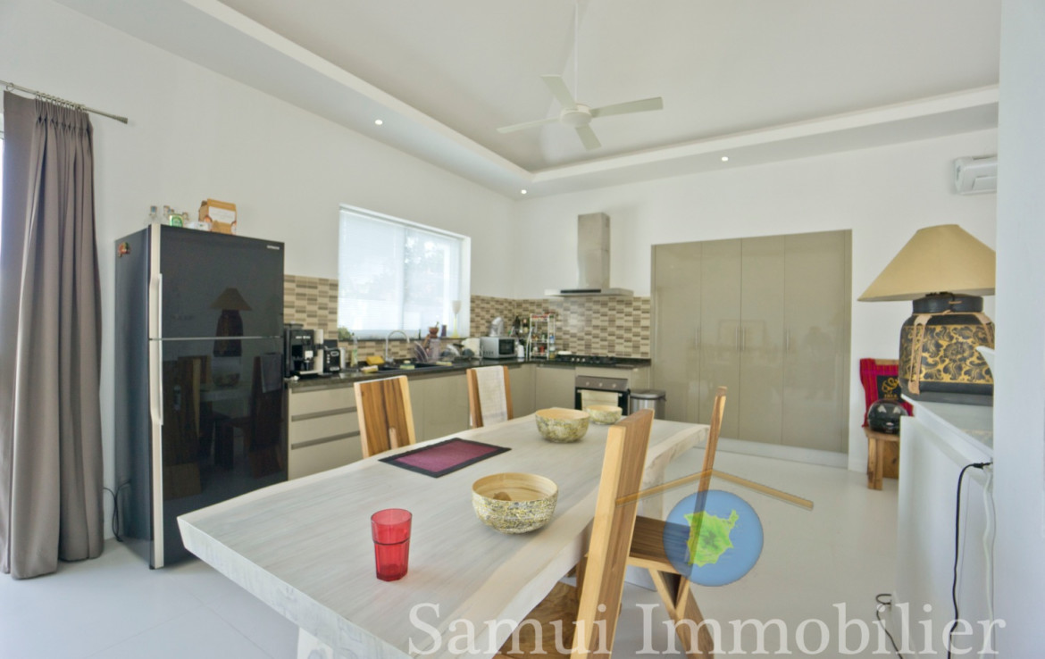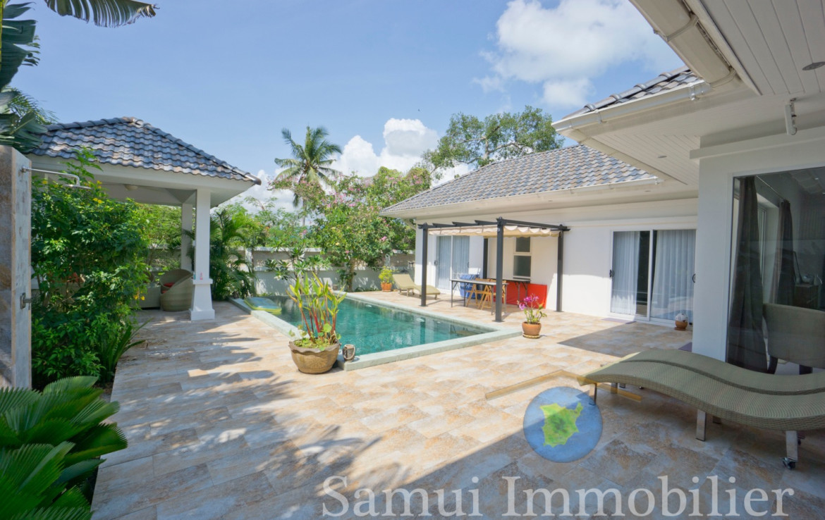 Assise sur un terrain plat de 420 , cette jolie villa contemporaine offre une surface habitable de 150 m².  Elle est installée dans un quartier résidentiel calme et tranquille, à seulement 700 m de la plage de Plai Laem