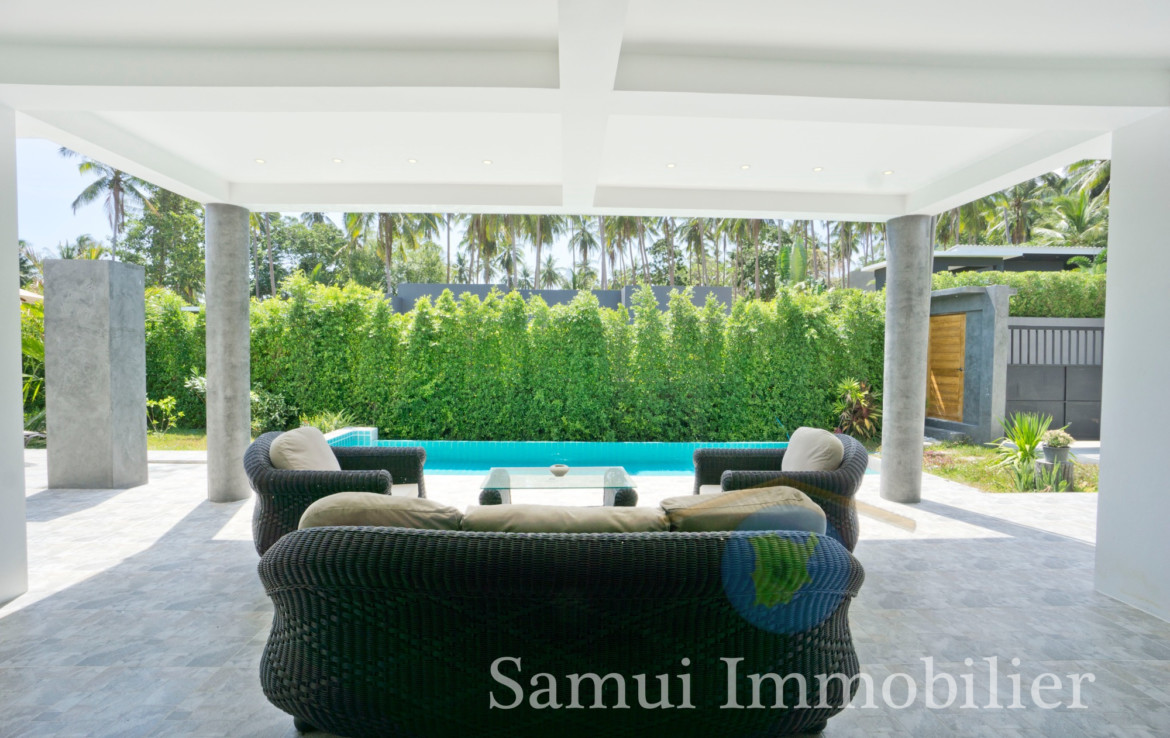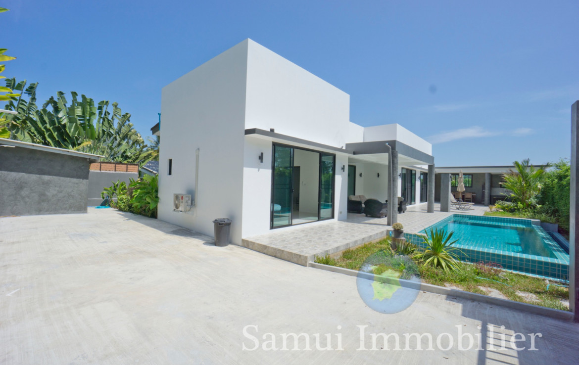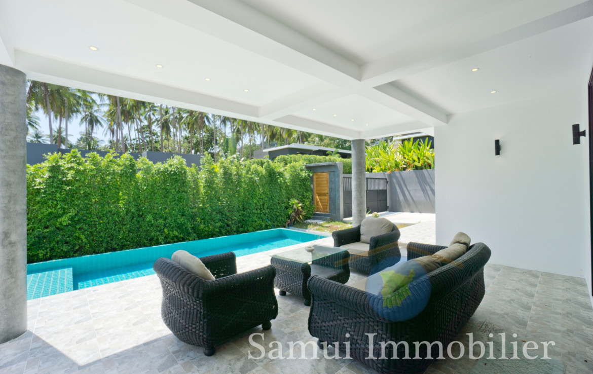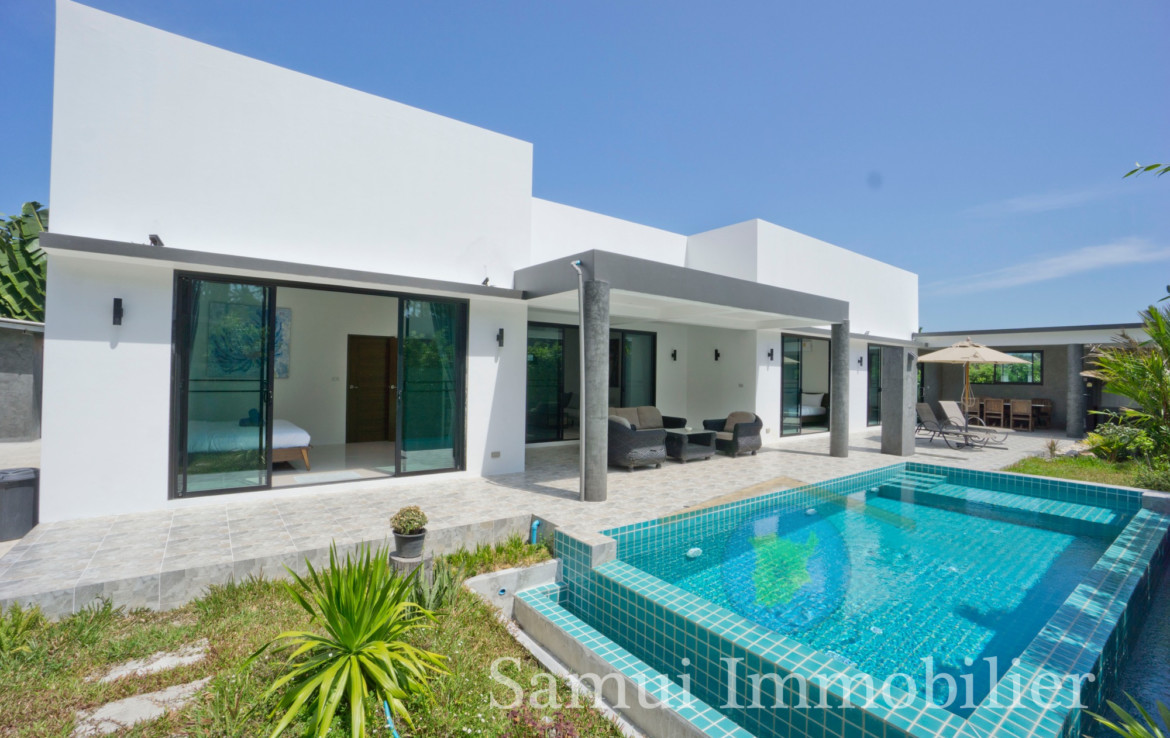 Située à 2,2 km de la plage de Maenam, cette belle villa de style contemporain est construite de plain-pied sur un terrain plat de 650 m² et offre une surface habitable totale sous toit de 170 m².
