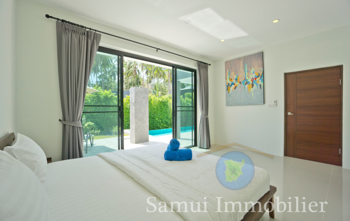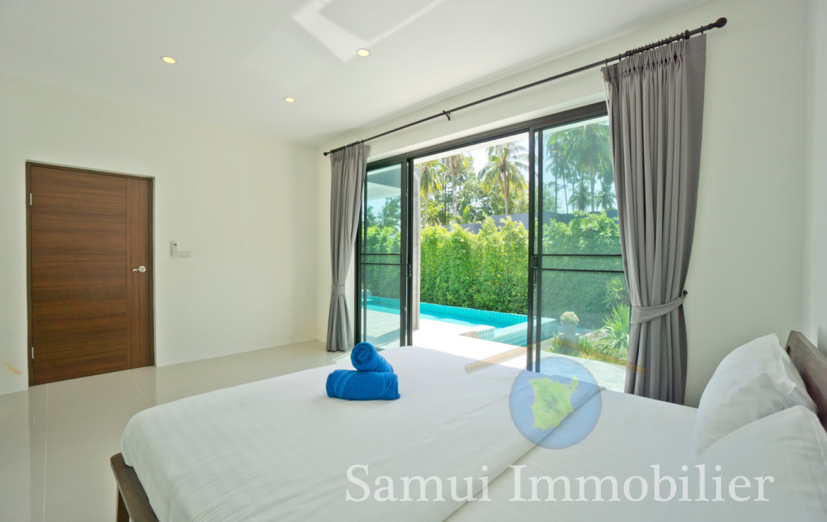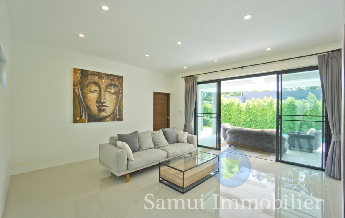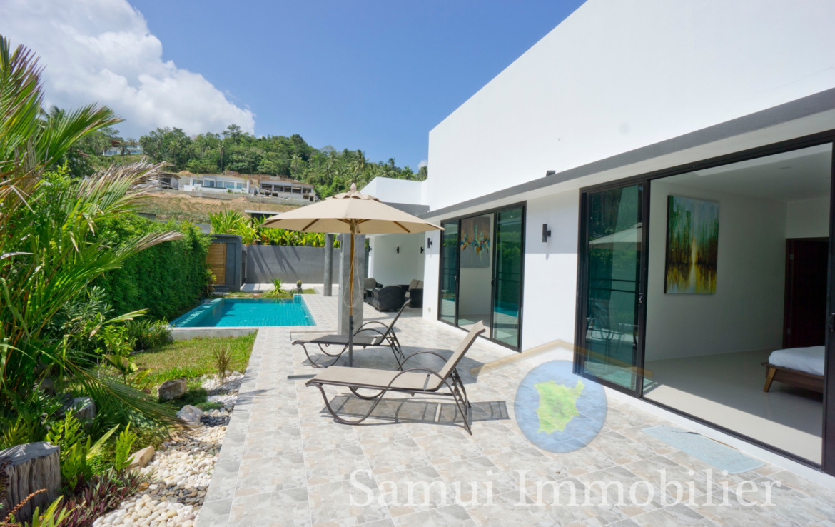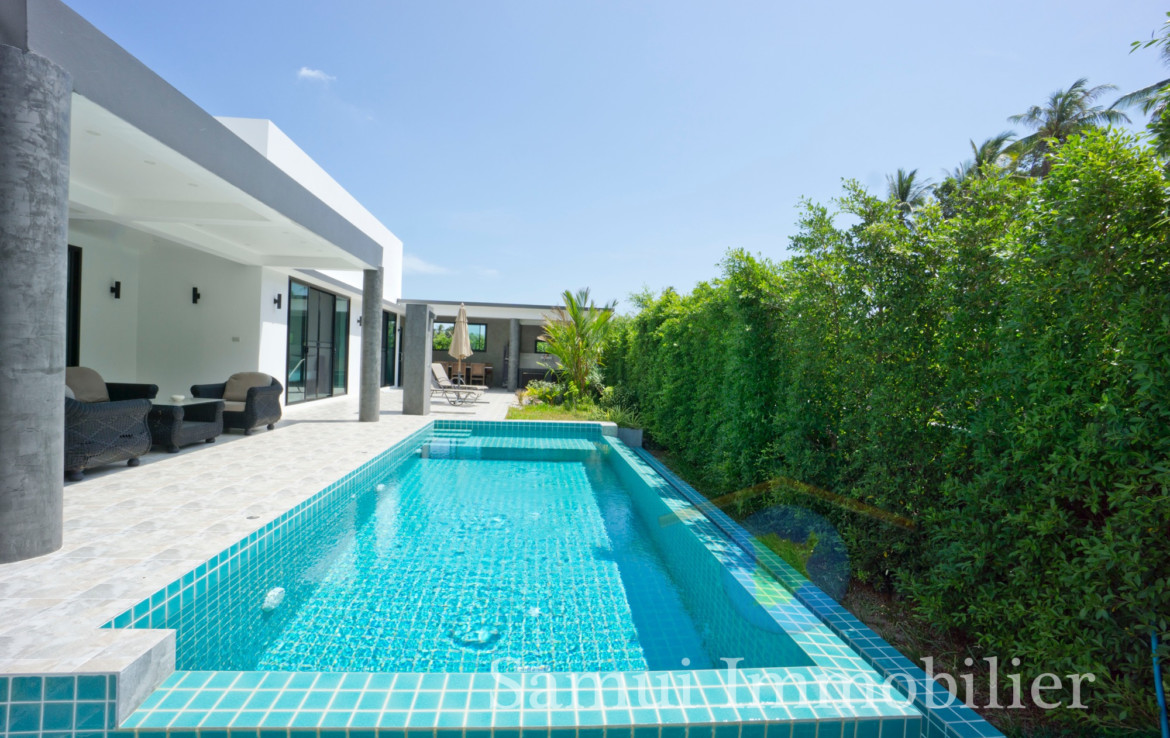 Située à 2,2 km de la plage de Maenam, cette belle villa de style contemporain est construite de plain-pied sur un terrain plat de 650 m² et offre une surface habitable totale sous toit de 170 m².